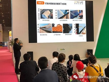 此次展會,整體展位設計風格獨特,茂林修竹,工商業(yè)光伏屋面配上潺潺流水,讓大家感受到了工業(yè)與綠色能源的美好融合。友科光伏屋面系統(tǒng)是將可發(fā)電的平面光伏瓦作為屋面建材,配以導水槽、屋面底板、通風屋脊等配件,組裝的光伏建筑一體化屋面系統(tǒng)。