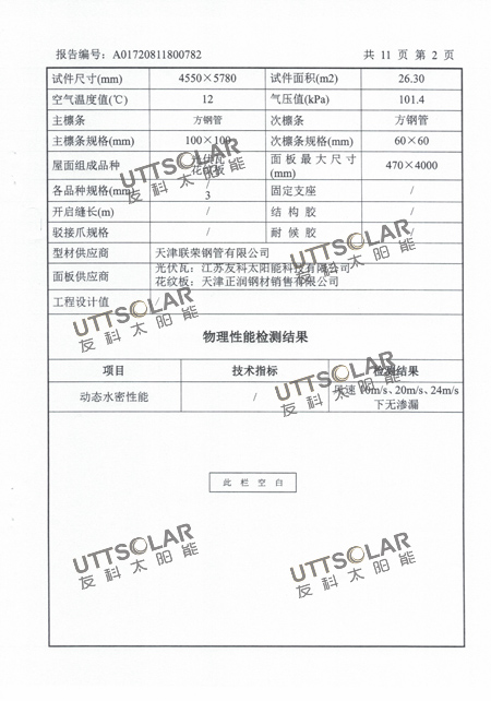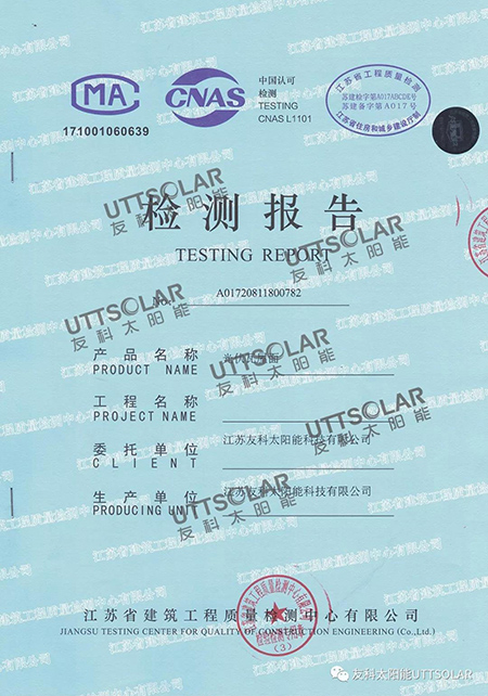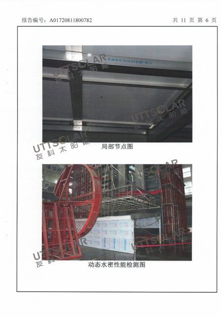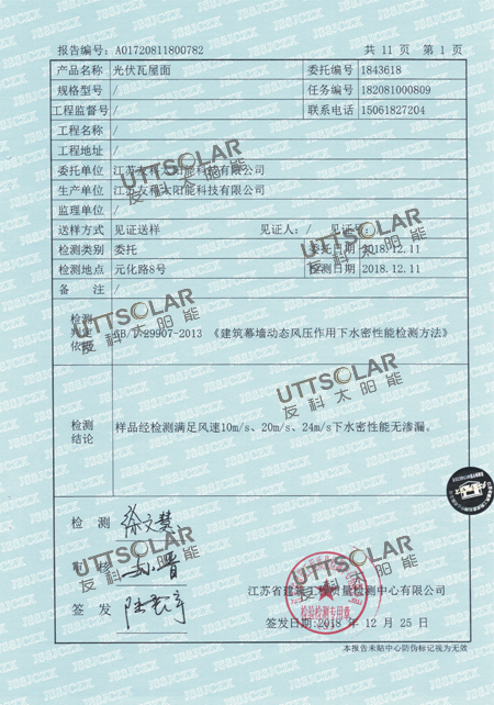 友科光伏瓦屋面 已經(jīng)通過(guò) 風(fēng)速10m/s、20m/s、24m/s 下的水密性能測(cè)試 證明了友科光伏瓦屋面可靠的防水性 ![]() 該試驗(yàn)由國(guó)內(nèi)建筑行業(yè)權(quán)威檢測(cè)機(jī)構(gòu): 江蘇省建筑工程質(zhì)量檢測(cè)中心 依據(jù)GB/T29907-2013 《建筑幕墻動(dòng)態(tài)風(fēng)壓作用 下水密性能檢測(cè)方法》標(biāo)準(zhǔn) 進(jìn)行檢測(cè)審核 結(jié)果為無(wú)滲漏!